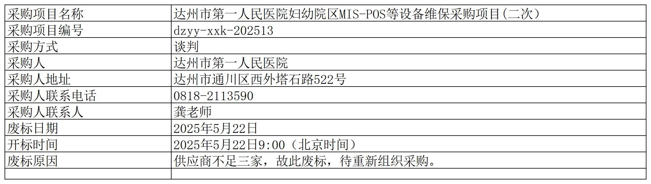 达州市第一人民医院妇幼院区MIS-POS等设备维保项目(二次)废标公告
