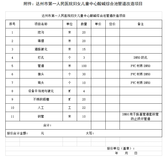 一、项目名称:达州市第一人民医院妇儿中心酸碱综合池管道改造项目。