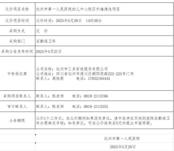 达州市第一人民医院妇儿中心院区外墙清洗项目议价结果公告