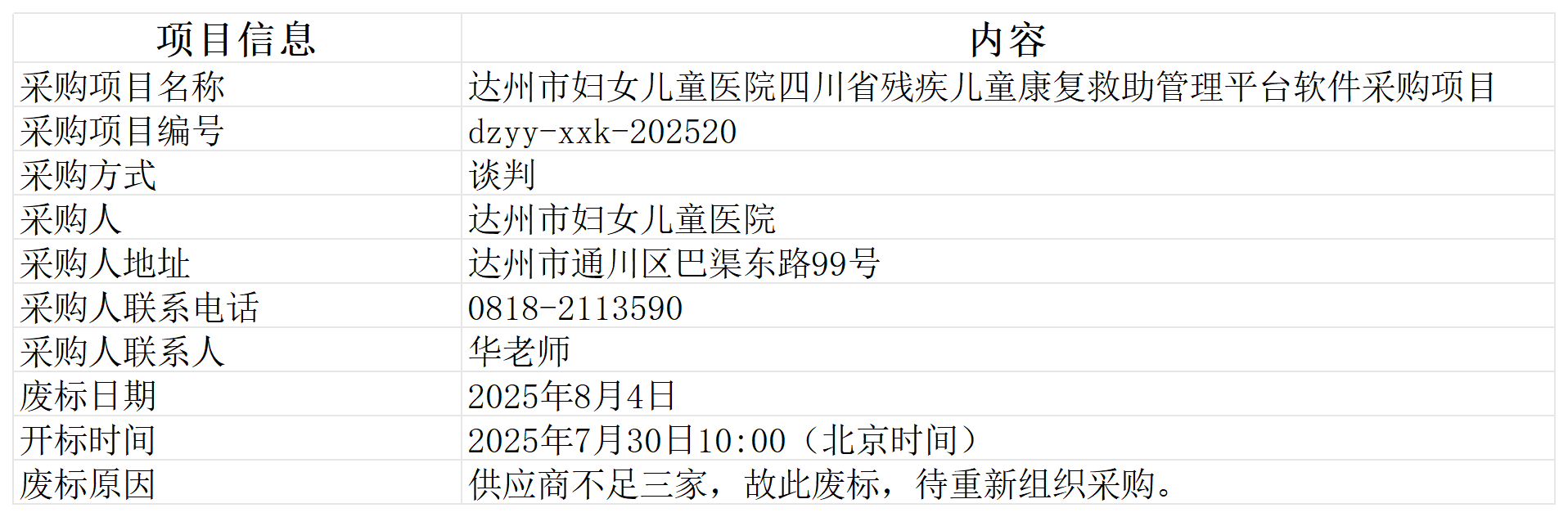 达州市妇女儿童医院关于 四川省残疾儿童康复救助管理平台软件采购项目废标公告