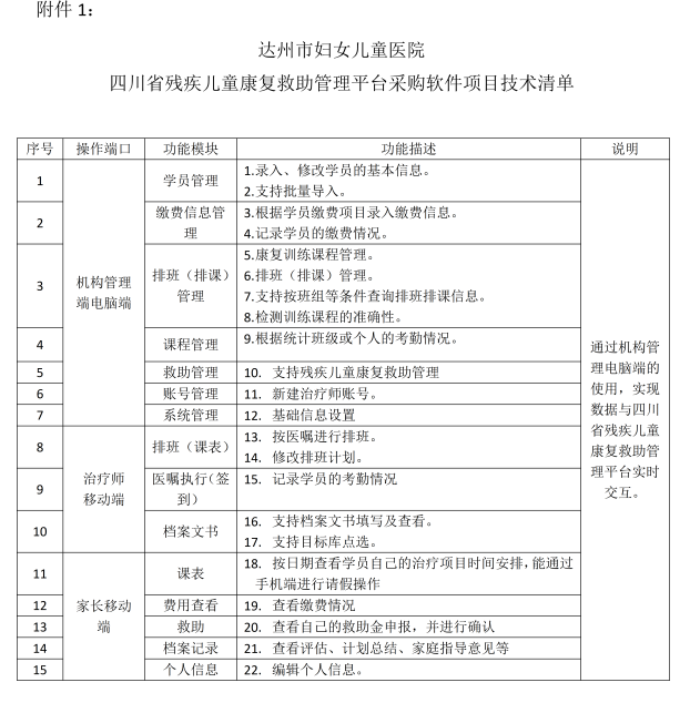 1、达州市妇女儿童医院四川省残疾儿童康复救助管理平台软件采购项目技术清单