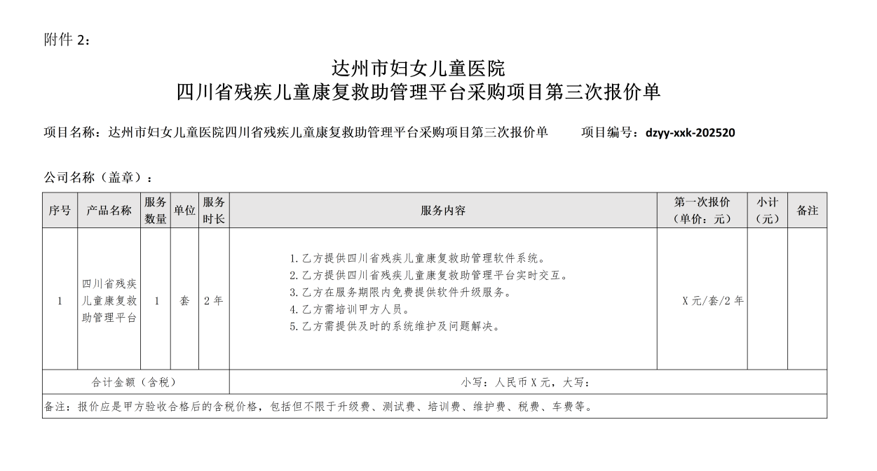 2、达州市妇女儿童医院四川省残疾儿童康复救助管理平台软件采购项目第三次报价单