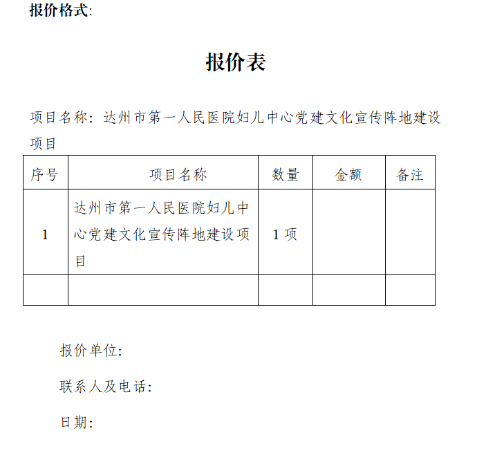 达州市第一人民医院妇儿中心现需对党建文化宣传阵地建设项目开展市场调研和征集相关资料。欢迎有资质、有意向的公司到达州市第一人民医院提供有关资料进行报名登记。