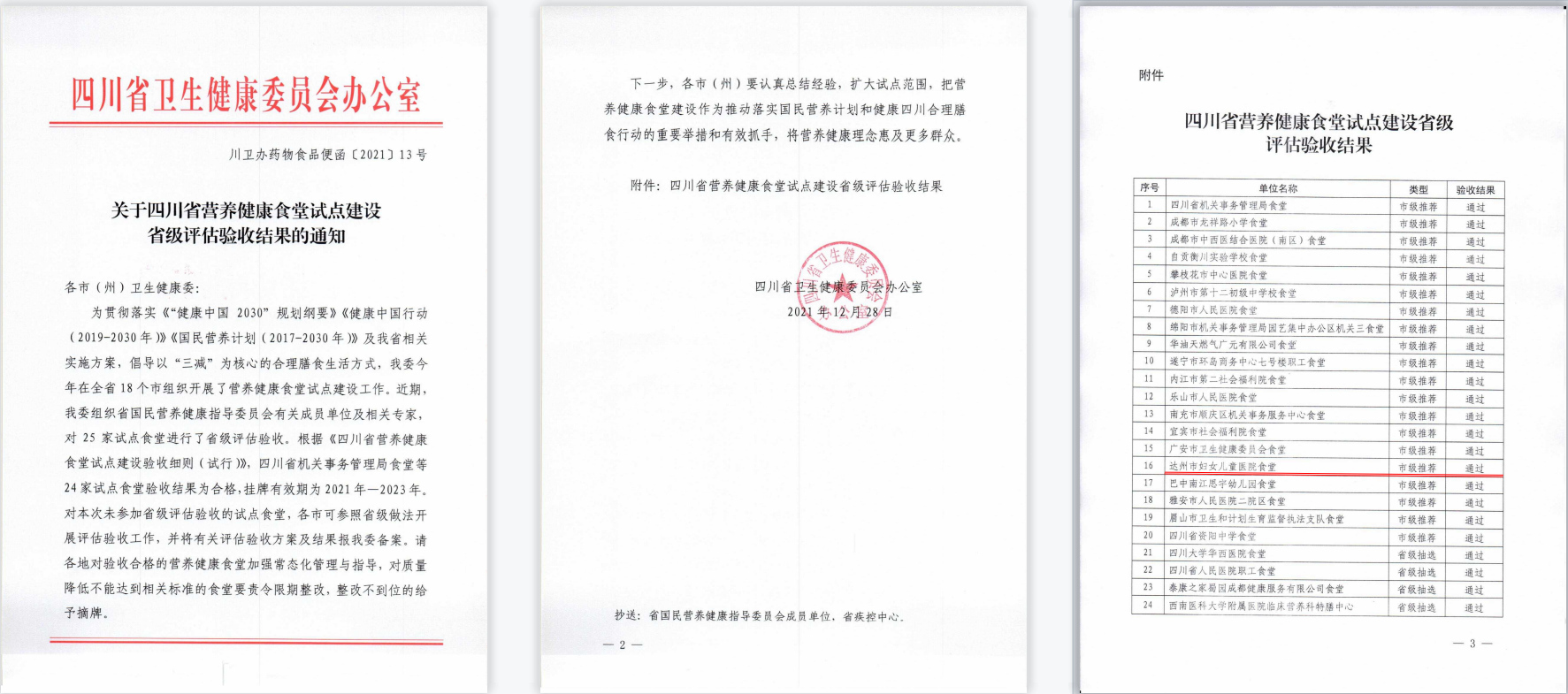 2021年12月28日,我院顺利通过四川省营养健康食堂试点建设省级评估验收,成功创建营养健康食堂。