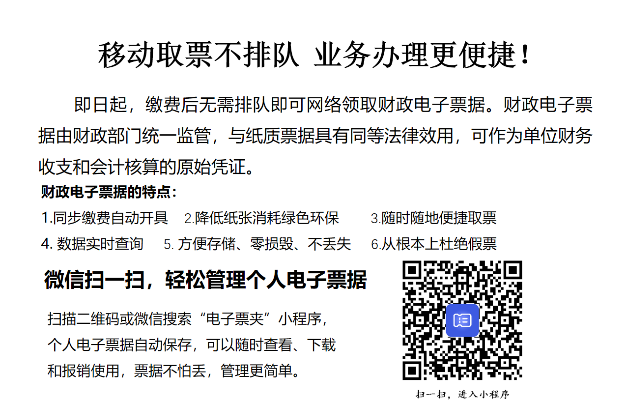 2、 手机用户通过扫描下方二维码,添加“电子票夹”小程序查看;