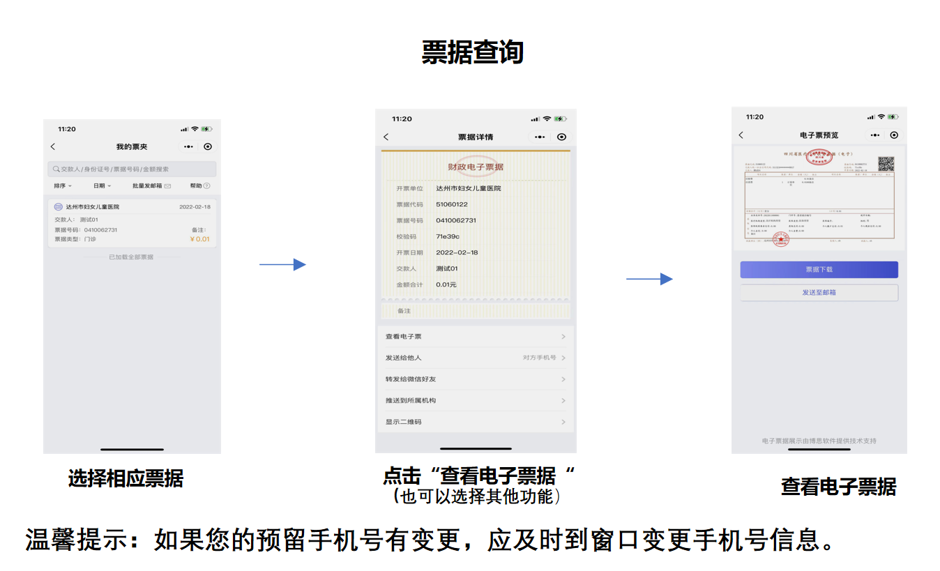 根据四川省财政厅印发的《四川省财政电子票据管理改革实施方案》(川财综[2019]21号)文件要求,同时为了适应现代财政制度改革和信息化发展的需要,进一步优化和完善门诊患者就诊流程,推进电子票据的社会化应用。为此,我院拟定于2022年3月上线门诊电子票据,患者及其家属可通过以下方式查看电子票据: